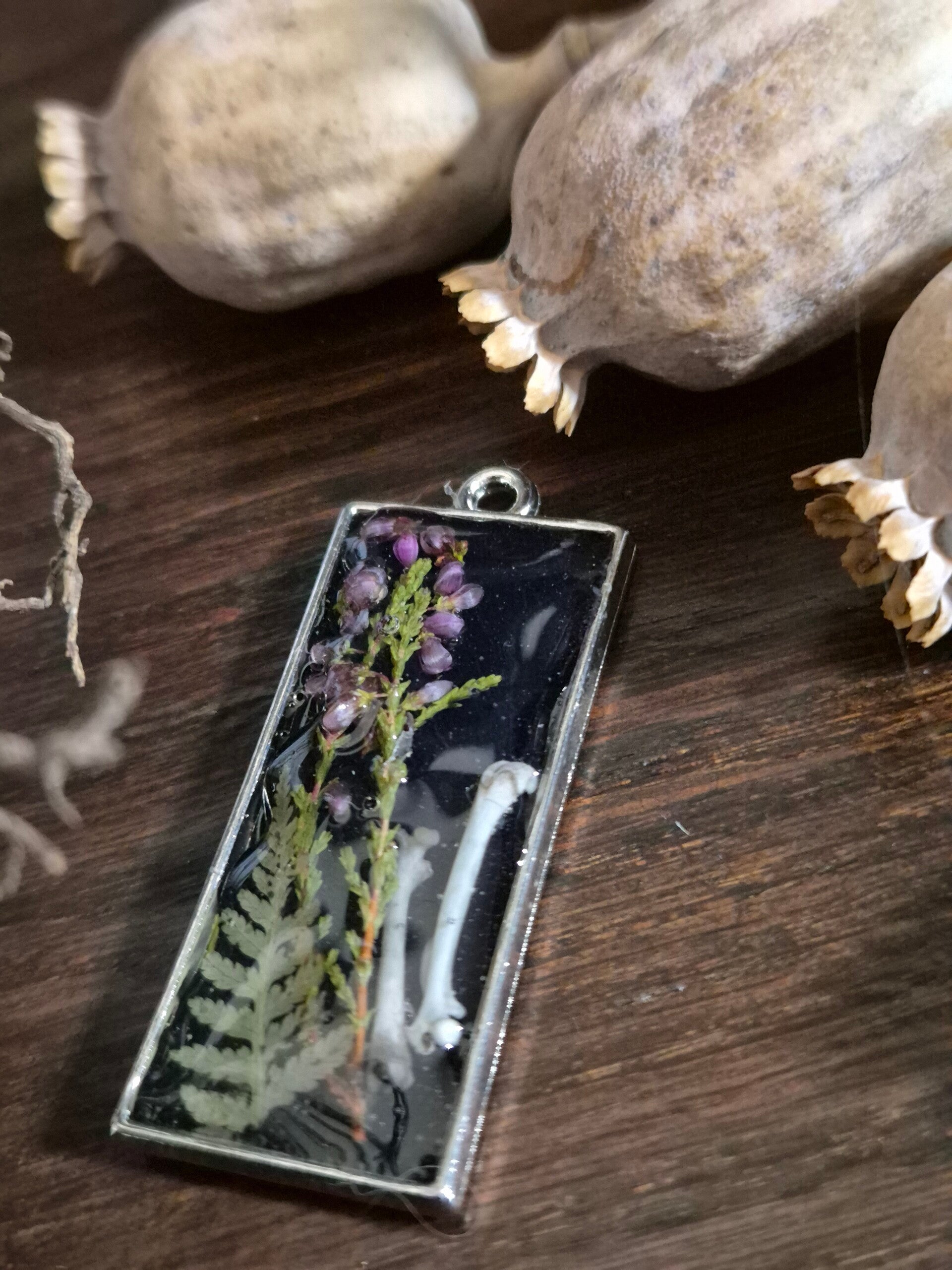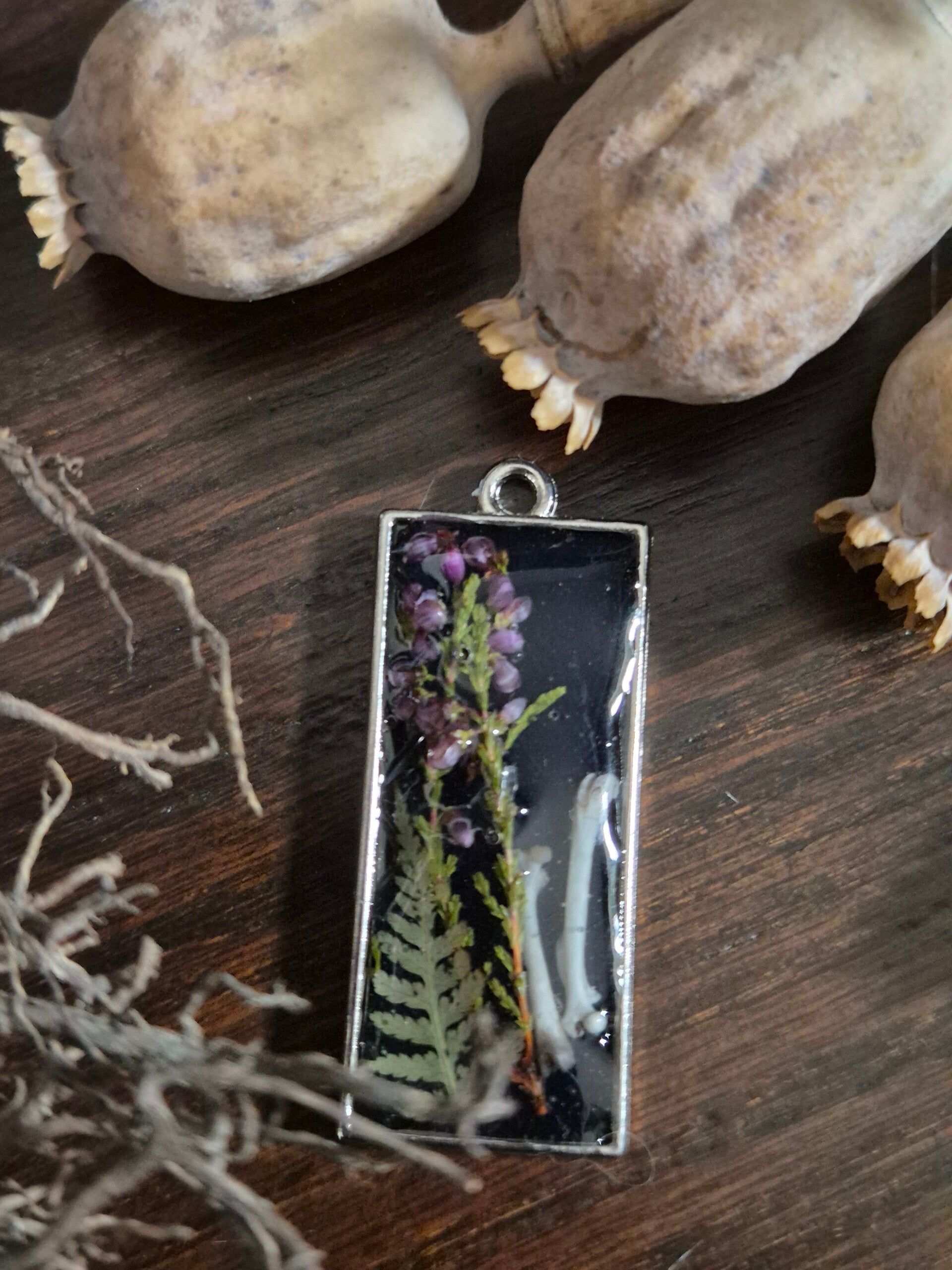 This rectangular pendant is a captured relic of the wild. Handcrafted in crystal resin, it holds a silent, profound magic: the delicate bones of a field mouse intertwined with the ephemeral beauty of local foraged flowers.