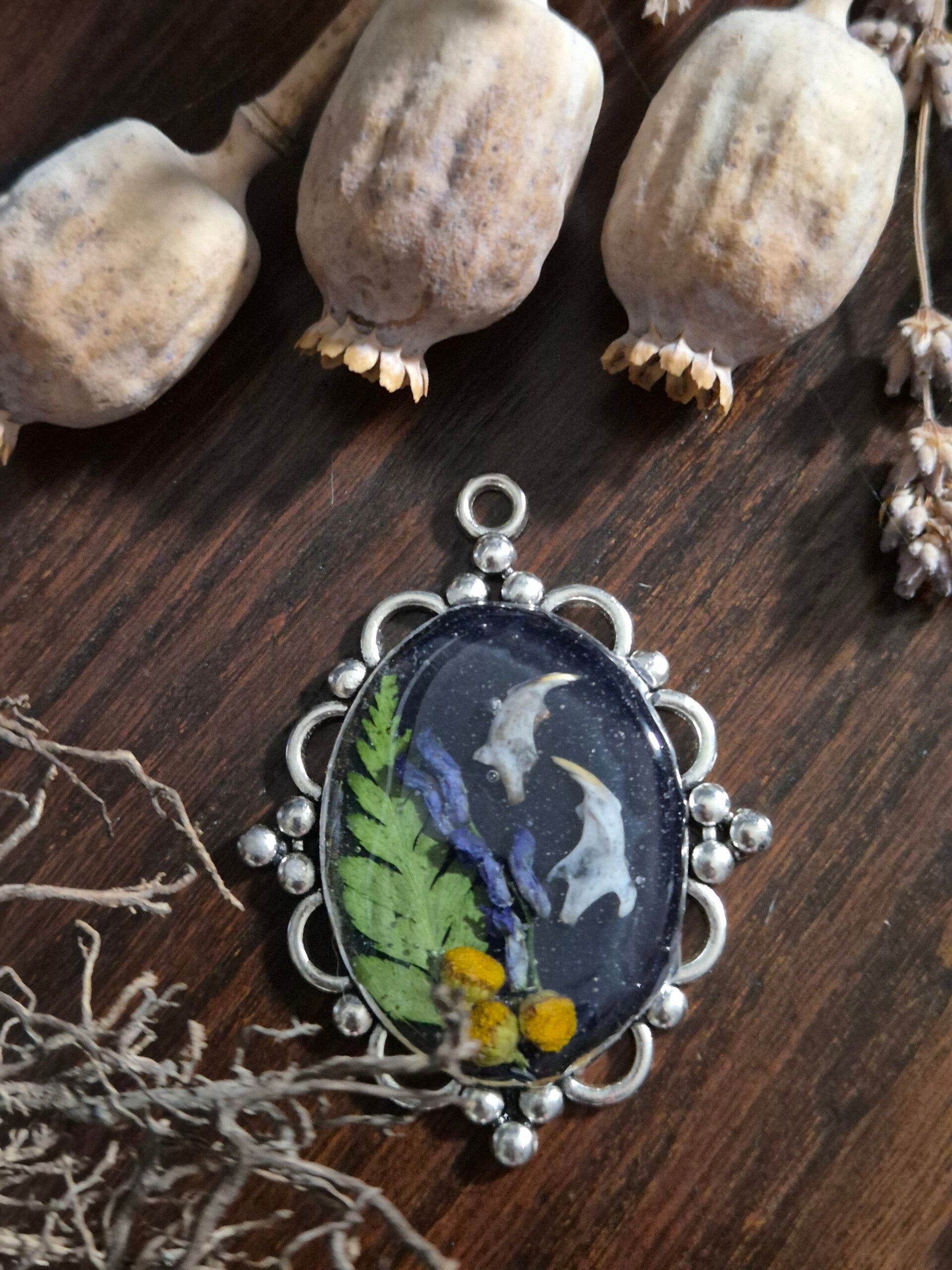 Within the deep, clear resin, a delicate mice jaw bone—a symbol of the quiet cycle of life and stillness—rests beside the ephemeral beauty of local foraged flowers. A tiny, spiral snail shell completes the dark tableau representing a journey into the hidden, mystic world.