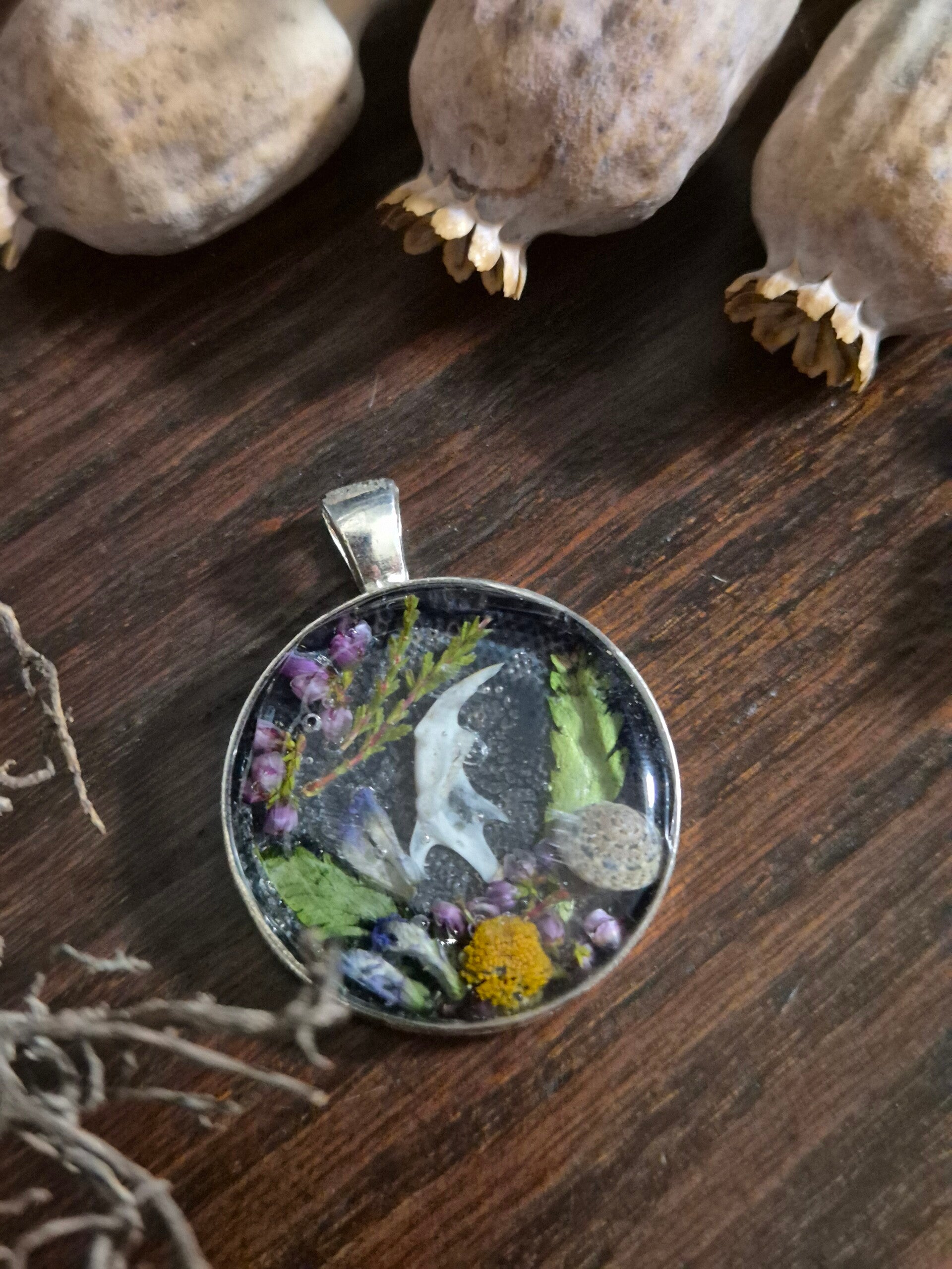 A deeply evocative and one-of-a-kind round resin pendant. This piece beautifully encapsulates a whispered secret from the forest floor, crafted entirely by hand.