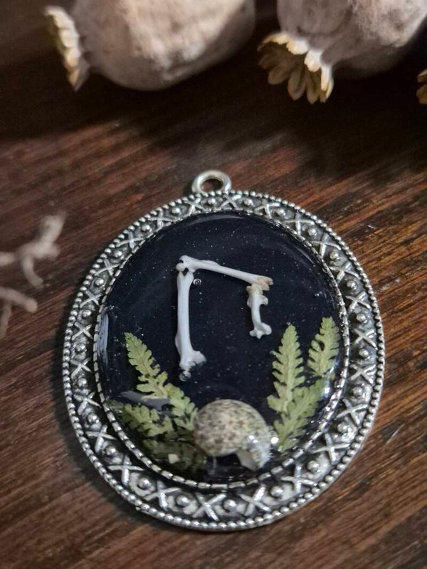 This captivating round resin pendant is a handcrafted conduit of raw, untamed force. Suspended within the clear sphere is a unique arrangement where the delicate structure of mice bones has been meticulously shaped into the Uruz Rune (ᚢ).